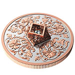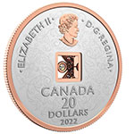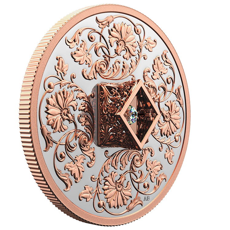 Selectively enhanced with rose gold plating, your coin’s reverse features an engraved design by Canadian artist Anna Bucciarelli, whose circular floral arrangement is composed of acanthus leaves and shapes inspired by cosmos and lilies. At the centre of the coin, a Canadian-sourced Fire and Icetm diamond is set in a rose gold-plated Dancing DiamondTM mount fashioned by Canadian-owned and operated Beverly Hills Jewellers; the 3D diamond cage features a diamond-shaped opening that provides a view of the stone’s every movement. The obverse features the selectively rose gold-plated effigy of Her Majesty Queen Elizabeth II by Susanna Blunt.